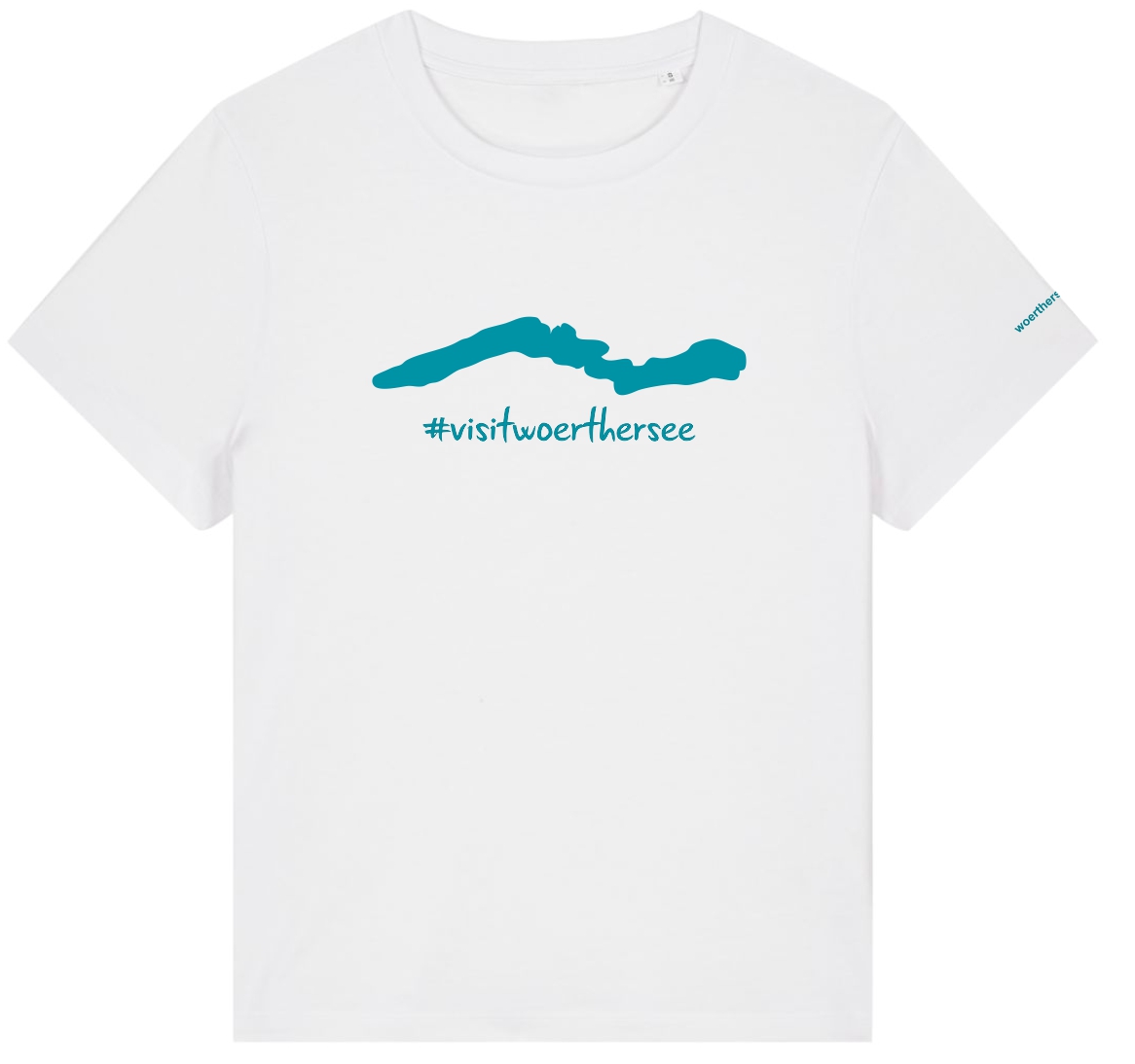 Damen T-Shirt mit Rundhalsausschnitt in weiß mit Aufdruck vorne auf der Brust "#visitwoerthersee" und am Ärmle "woerthersee.com" in türkis.